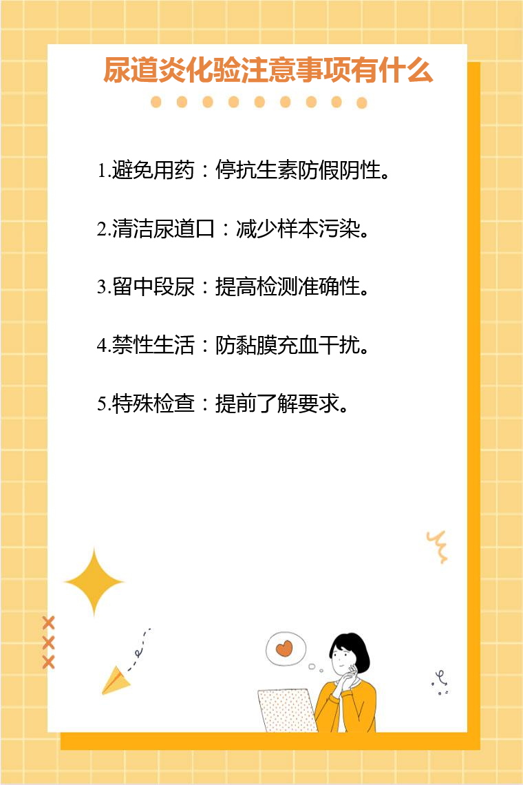 尿道炎化验注意事项有检查前避免用药、清洁尿道口、留取中段尿、避免性生活、了解特殊检查要求等。
