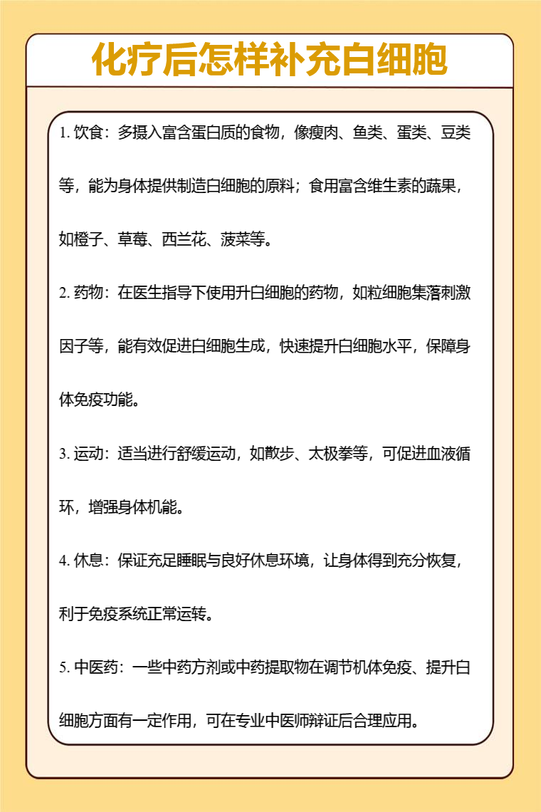 化疗后补充白细胞需综合多方面进行。日常要养成健康的生活方式,保持积极心态。同时,严格按照医生嘱咐定期复查血常规,及时了解白细胞变化情况,以便调整补充方案,确保身体能更好地恢复。