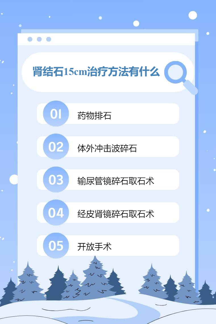 肾结石15cm的治疗方法有药物排石、体外冲击波碎石、输尿管镜碎石取石术、经皮肾镜碎石取石术、开放手术等。