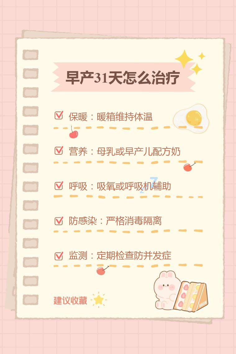 早产 31 天的治疗方法主要有保暖、营养支持、呼吸支持、预防感染、监测与治疗并发症等。