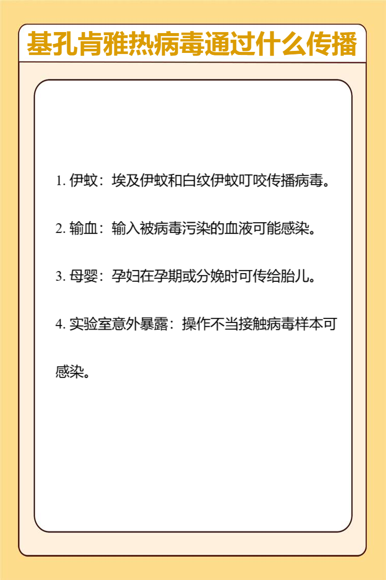 基孔肯雅热病毒主要通过伊蚊、输血、母婴、实验室意外暴露等传播。
