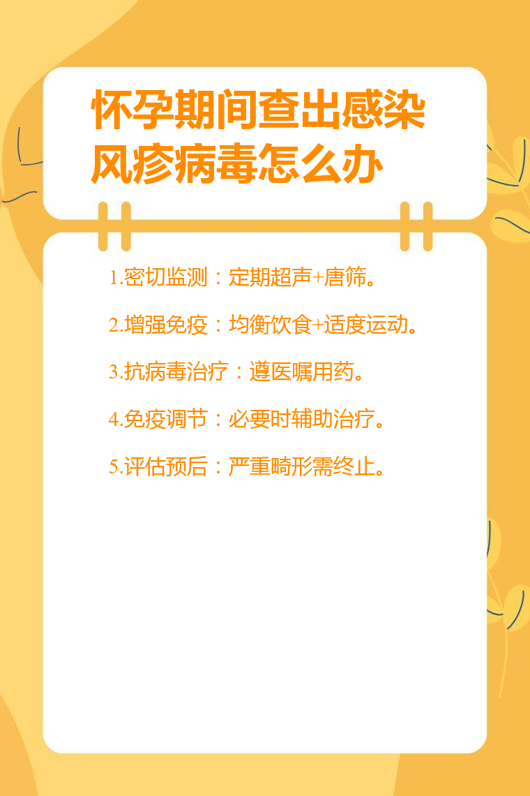 怀孕期间查出感染风疹病毒可通过密切监测、调整生活方式、抗病毒治疗、免疫调节治疗、必要时终止妊娠等方法应对。