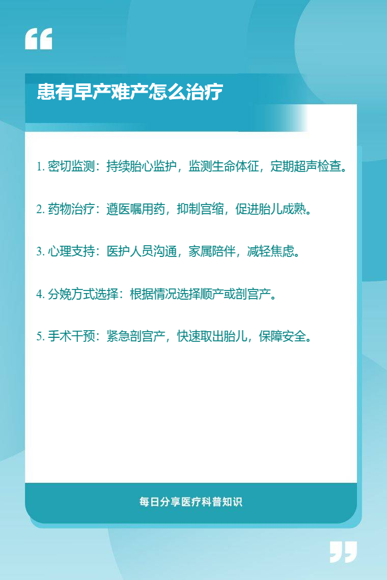 患有早产难产的治疗方法包括密切监测、药物治疗、心理支持、分娩方式选择、手术干预等。