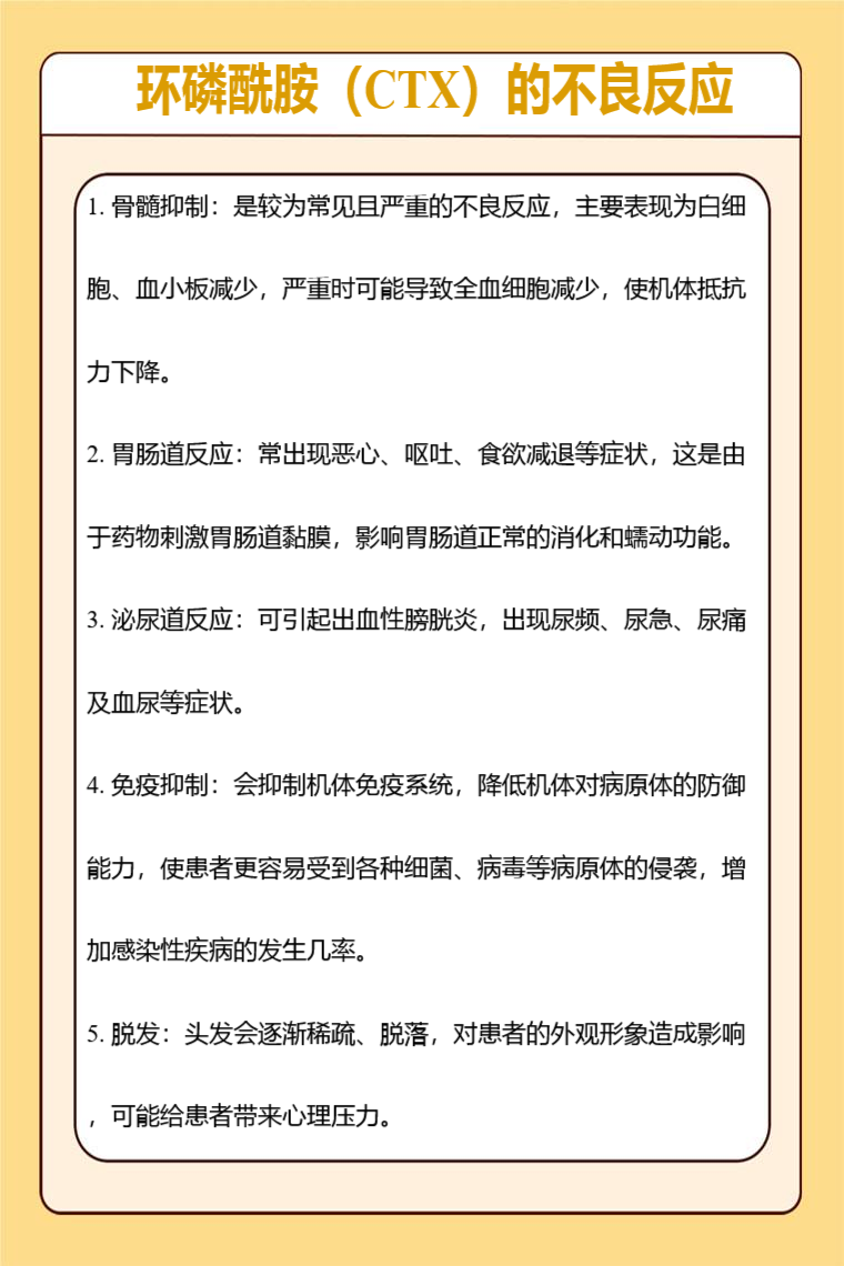 3. 泌尿道反应:可引起出血性膀胱炎,出现尿频、尿急、尿痛及血尿等症状,长期使用还可能损害肾功能,对泌尿系统造成持续性损伤。