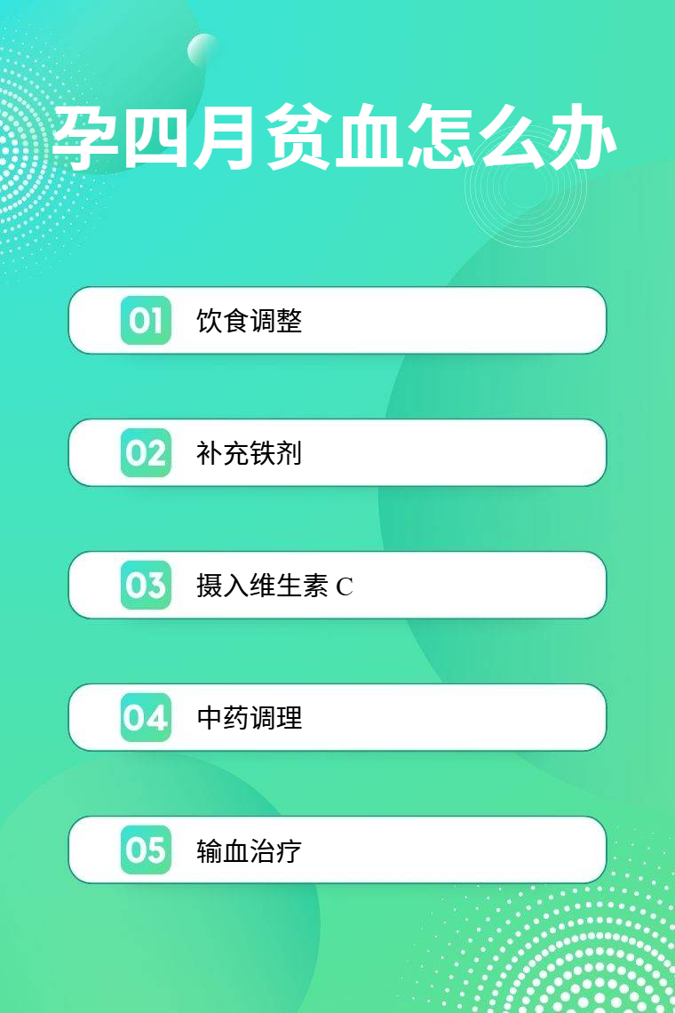 孕四月贫血可通过饮食调整、补充铁剂、摄入维生素 C、中药调理、输血治疗等方法改善。