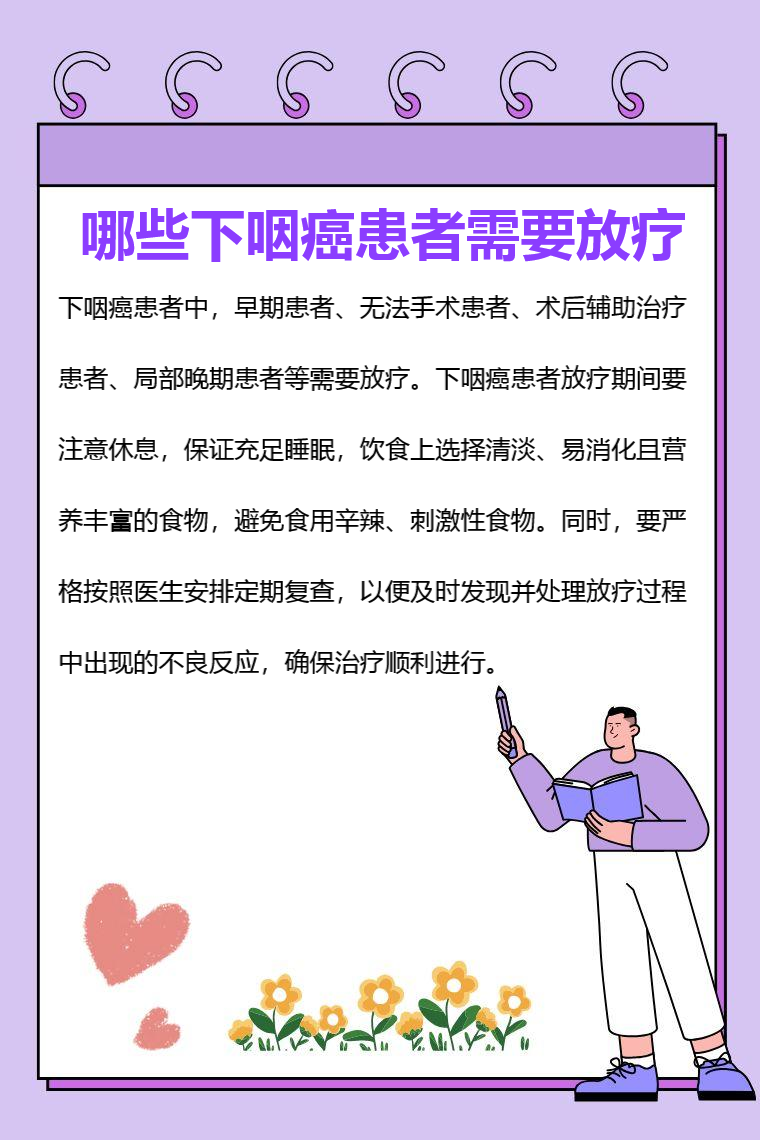 下咽癌患者中,早期患者、无法手术患者、术后辅助治疗患者、局部晚期患者等需要放疗。