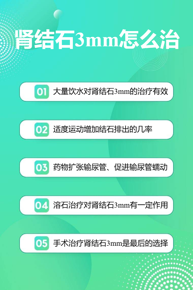肾结石3mm可通过大量饮水、适度运动、药物排石、溶石治疗、手术治疗等方法处理。