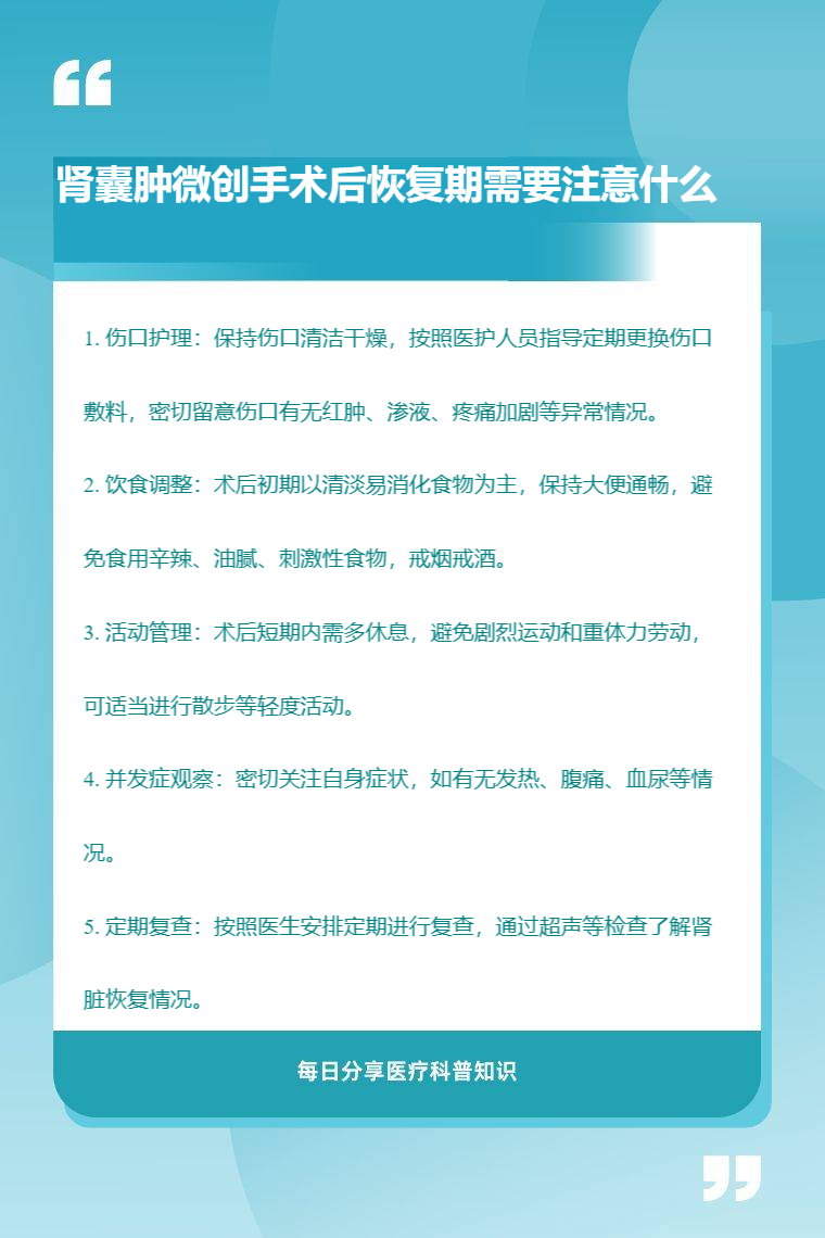 肾囊肿微创手术后恢复期需要注意伤口护理、饮食调整、活动管理、并发症观察、定期复查等。