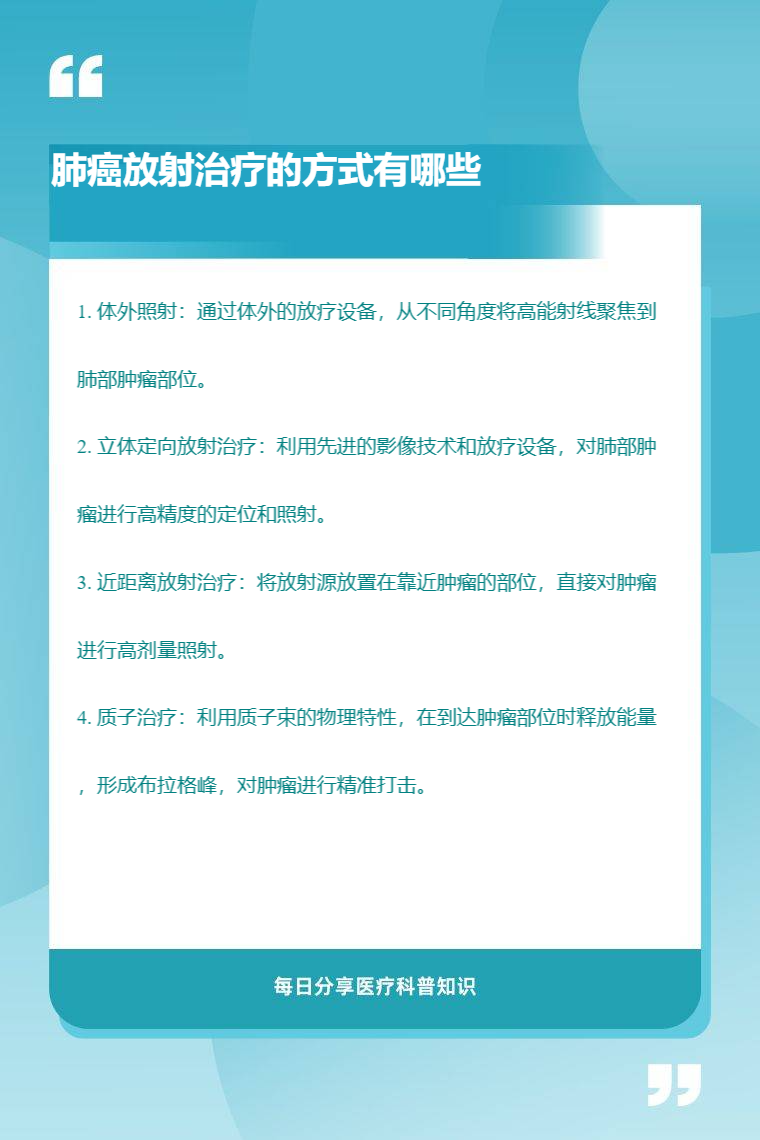 肺癌放射治疗的方式有体外照射、立体定向放射治疗、近距离放射治疗、质子治疗等。