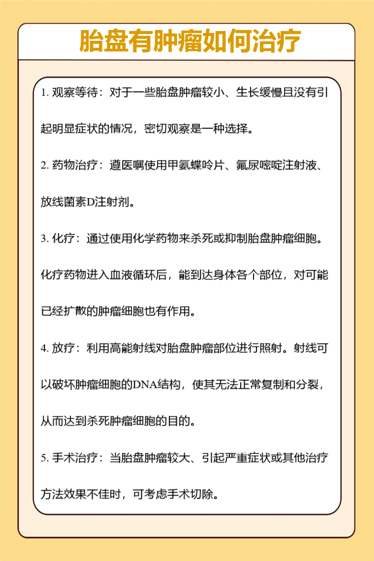 胎盘有肿瘤的治疗方法包括观察等待、药物治疗、化疗、放疗、手术治疗等。