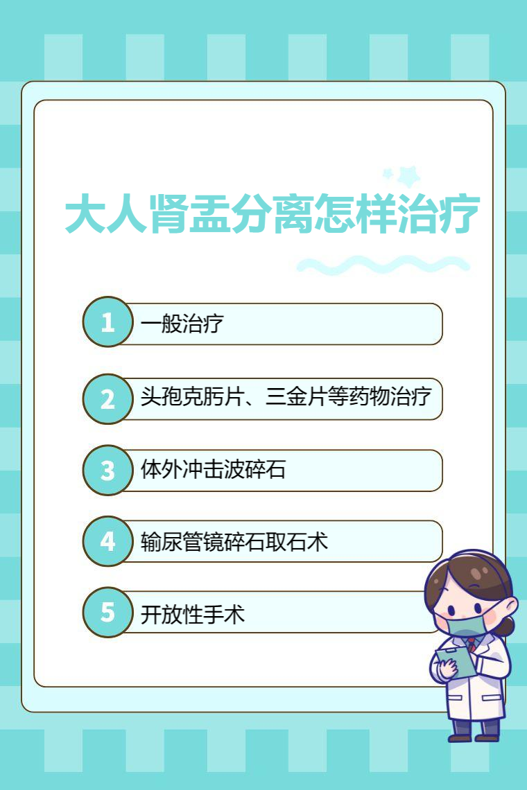 大人肾盂分离的治疗方法有一般治疗、药物治疗、体外冲击波碎石、输尿管镜碎石取石术、开放性手术等。