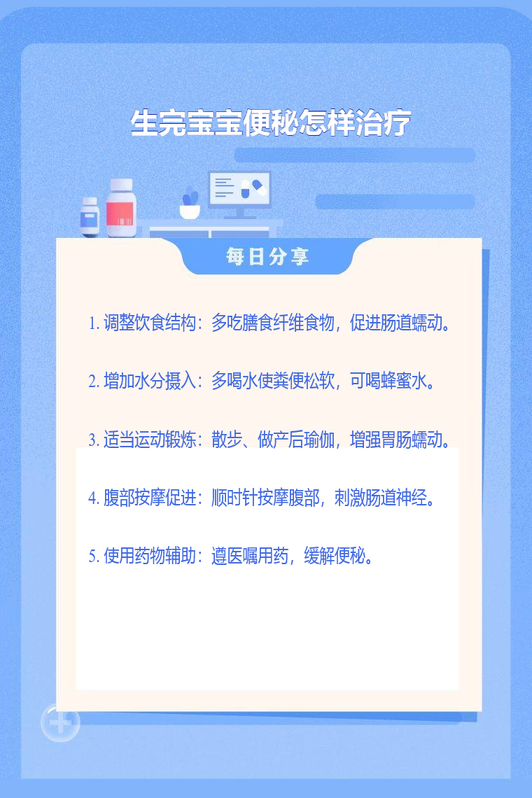 生完宝宝便秘可通过调整饮食结构、增加水分摄入、适当运动锻炼、腹部按摩促进、使用药物辅助等方法治疗。