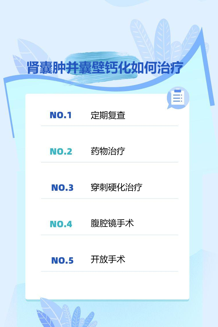 肾囊肿并囊壁钙化的治疗方法有定期复查、药物治疗、穿刺硬化治疗、腹腔镜手术、开放手术等。