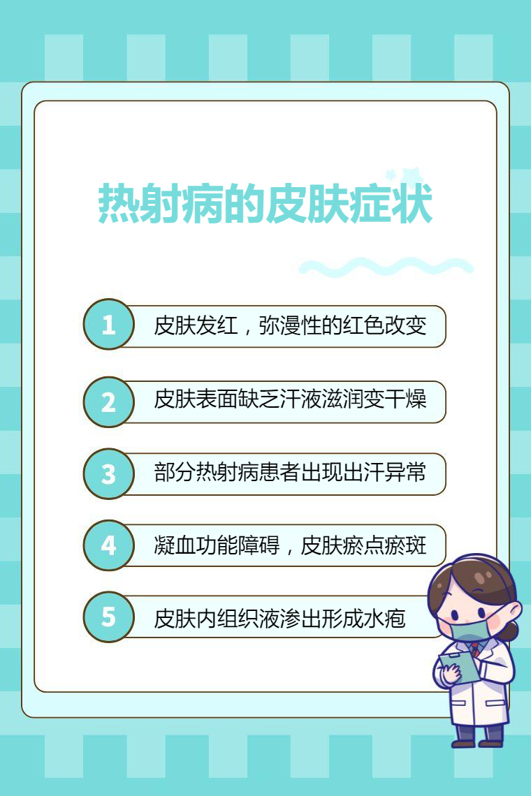 热射病的皮肤症状有皮肤发红、皮肤干燥、皮肤出汗异常、皮肤瘀点瘀斑、皮肤水疱等。