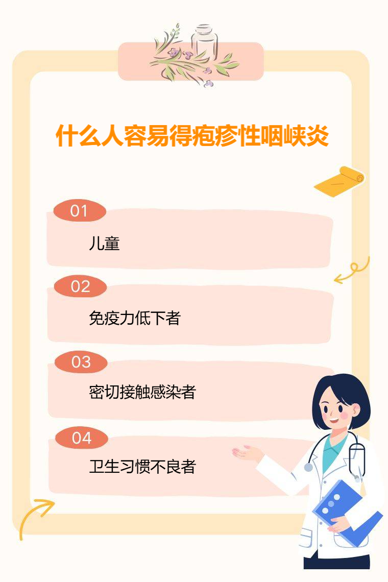 儿童、免疫力低下者、密切接触感染者、卫生习惯不良者等容易得疱疹性咽峡炎。