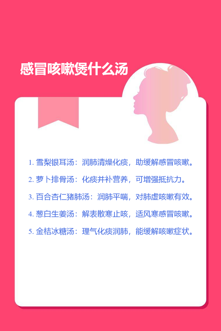 感冒咳嗽可煲的汤有雪梨银耳汤、萝卜排骨汤、百合杏仁猪肺汤、葱白生姜汤、金桔冰糖汤等。
