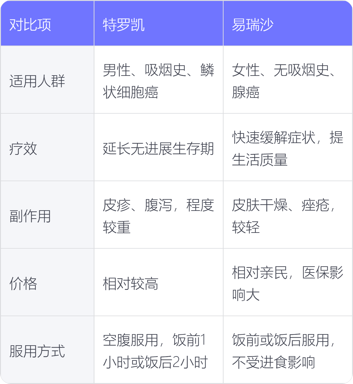 特罗凯和易瑞沙在适用人群、疗效、副作用、价格、服用方式上存在不同。