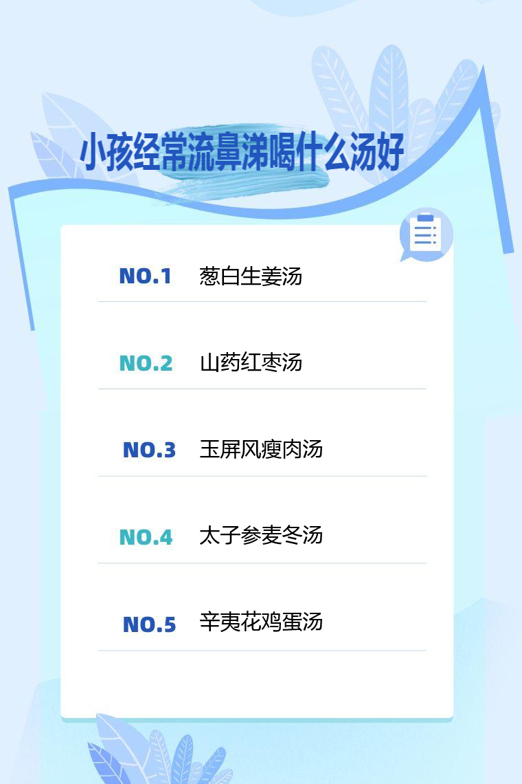 小孩经常流鼻涕可喝的汤有葱白生姜汤、山药红枣汤、玉屏风瘦肉汤、太子参麦冬汤、辛夷花鸡蛋汤等。