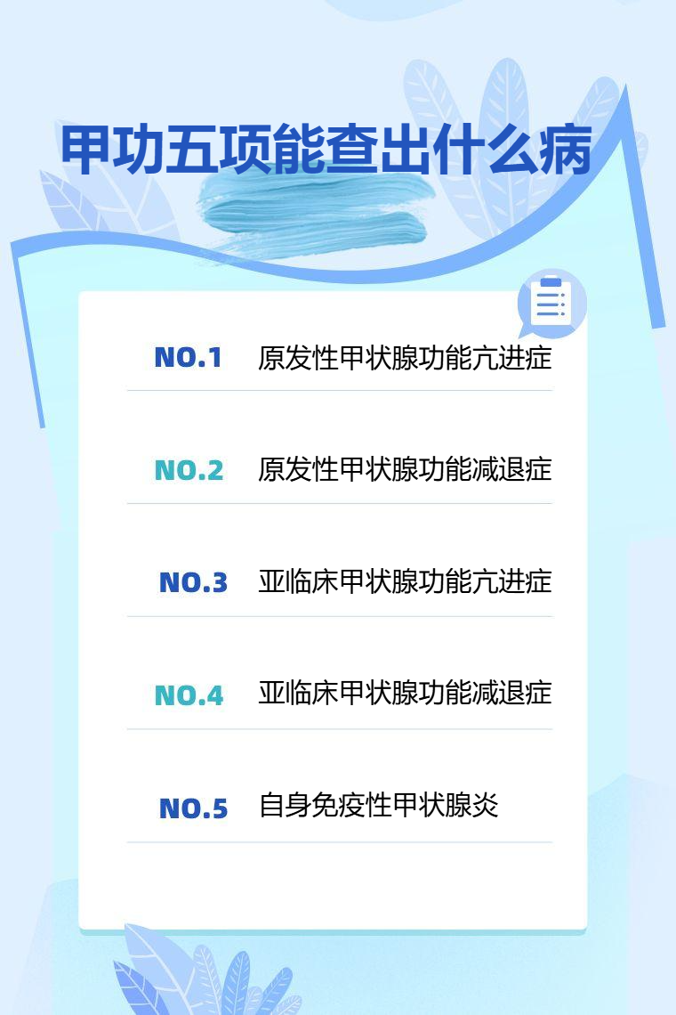 甲功五项能查出原发性甲状腺功能亢进症、原发性甲状腺功能减退症、亚临床甲状腺功能亢进症、亚临床甲状腺功能减退症、自身免疫性甲状腺炎等。
