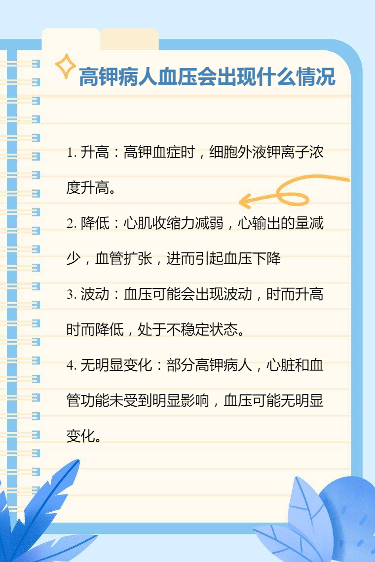 3. 波动:高钾血症过程中,机体的神经内分泌系统会进行调节。肾素-血管紧张素-醛固酮系统等被激活,试图调节体内钾离子平衡和维持血压稳定。但在这一调节过程中,血压可能会出现波动,时而升高时而降低,处于不稳定状态。