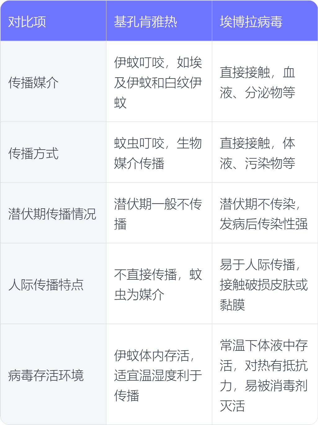 基孔肯雅热与埃博拉病毒在传播媒介、传播方式、潜伏期传播情况、人际传播特点、病毒存活环境方面存在不同。
