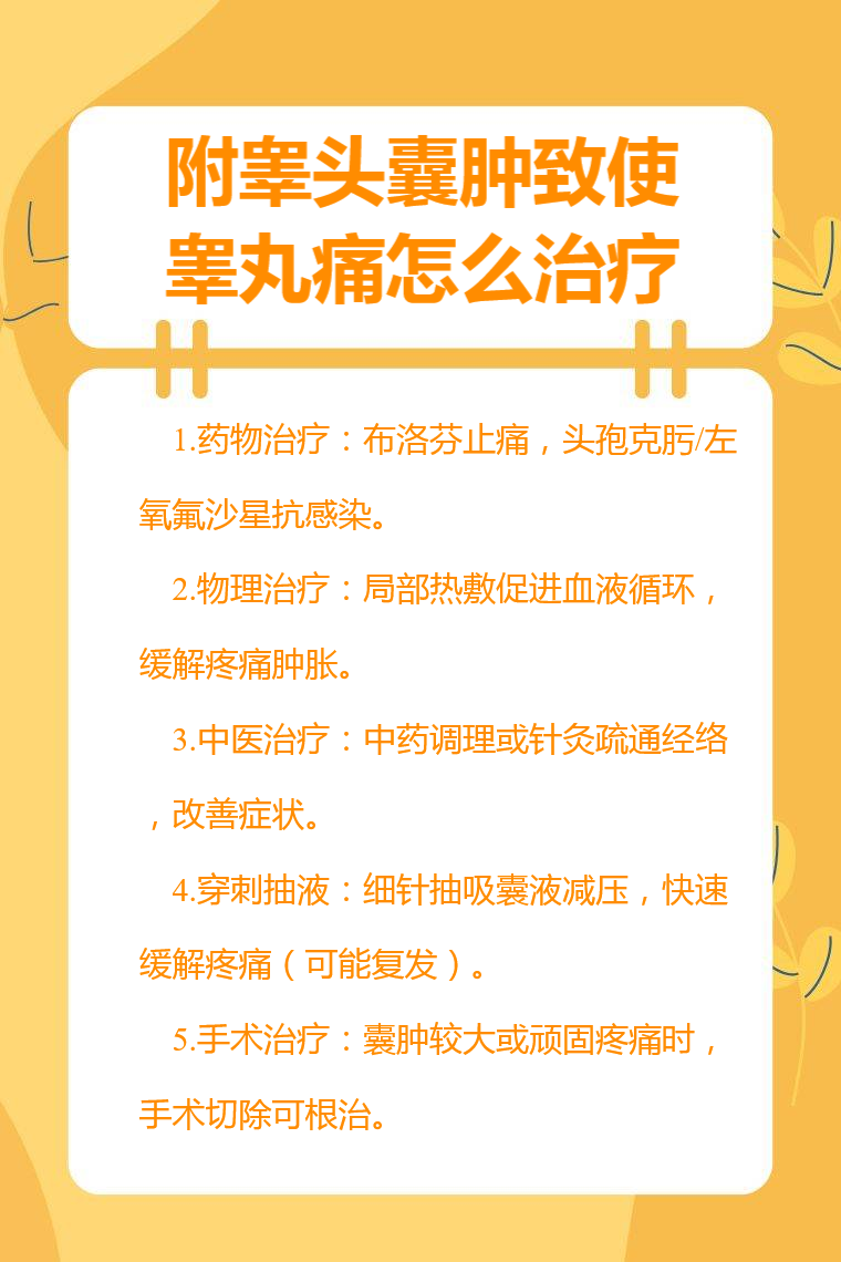 附睾头囊肿致使睾丸痛可通过药物治疗、物理治疗、中医治疗、穿刺抽液、手术治疗等方法来缓解。