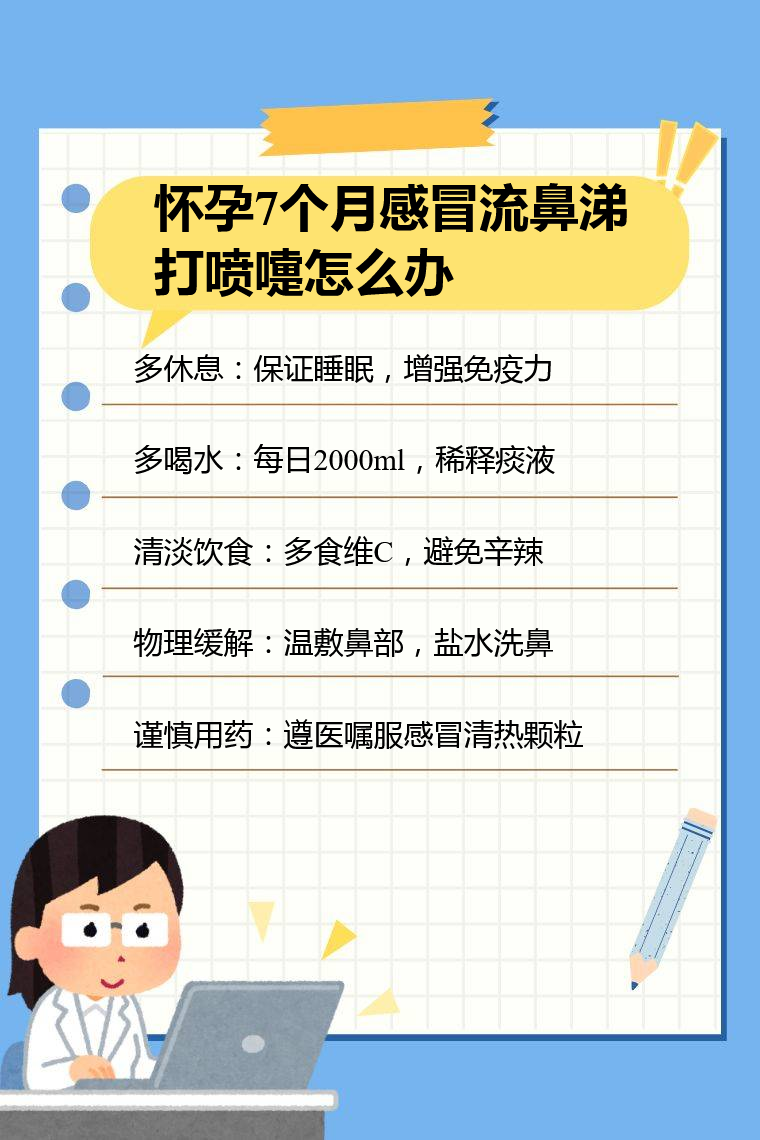 怀孕7个月感冒流鼻涕打喷嚏可通过多休息、补充水分、饮食调理、物理缓解、合理用药等方法来应对。