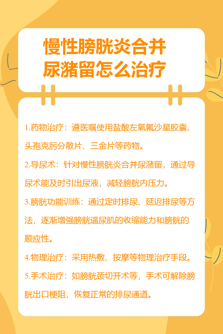 慢性膀胱炎合并尿潴留的治疗方法主要有药物治疗、导尿术、膀胱功能训练、物理治疗、手术治疗等。