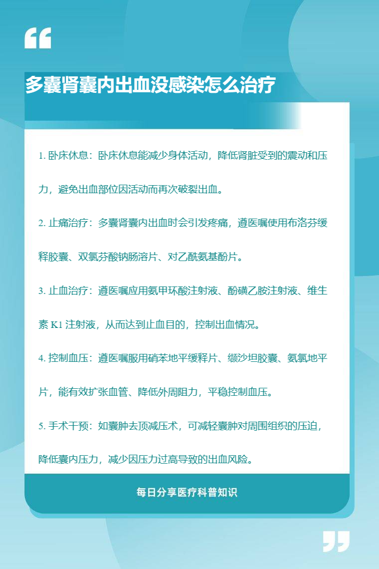 多囊肾囊内出血没感染可通过卧床休息、止痛治疗、止血治疗、控制血压、手术干预等方法治疗。