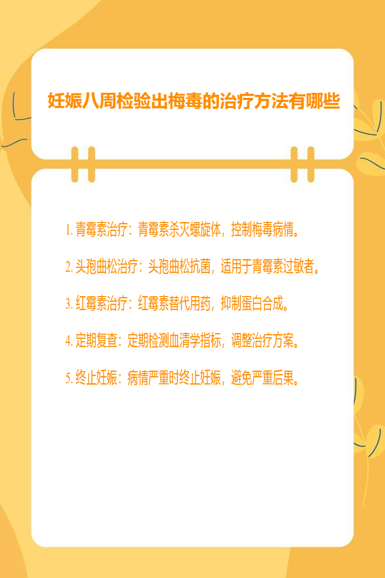 妊娠八周检验出梅毒的治疗方法有青霉素治疗、头孢曲松治疗、红霉素治疗、定期复查、终止妊娠等。