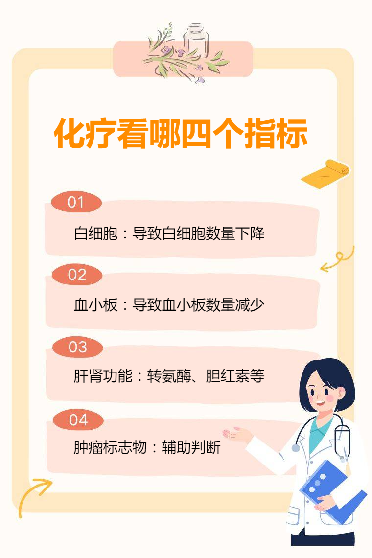 化疗通常看白细胞、血小板、肝肾功能、肿瘤标志物等指标。