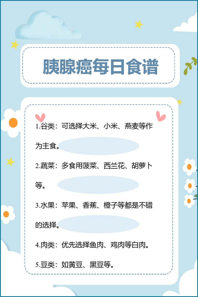 胰腺癌每日食谱包含谷类、蔬菜、水果、肉类、豆类等。