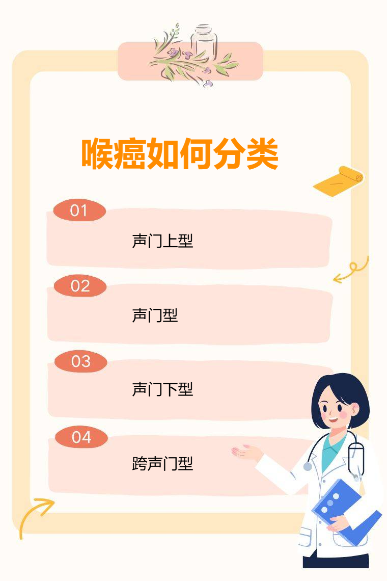 喉癌主要分为声门上型、声门型、声门下型、跨声门型等。