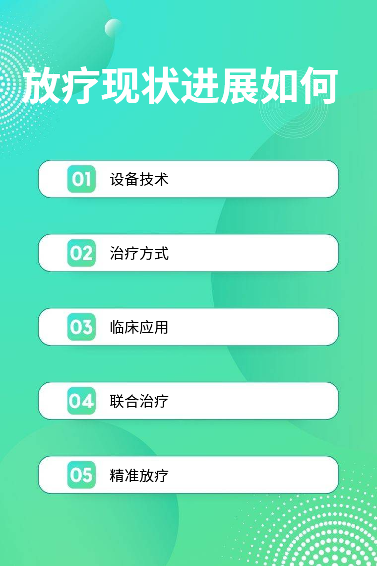 放疗现状进展体现在设备技术、治疗方式、临床应用、联合治疗、精准放疗等方面。