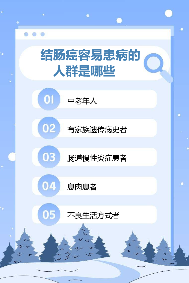 结肠癌容易患病的人群有中老年人、有家族遗传病史者、肠道慢性炎症患者、息肉患者、不良生活方式者等。