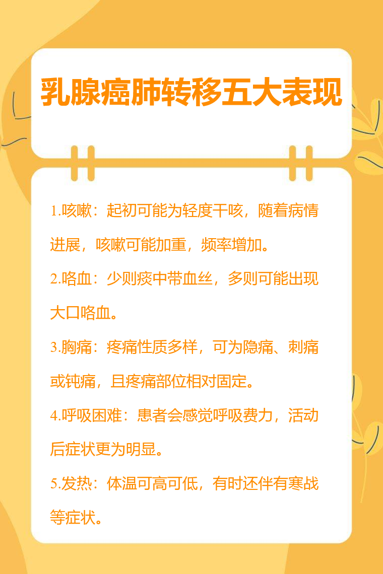 乳腺癌肺转移的五大表现为咳嗽、咯血、胸痛、呼吸困难、发热等。