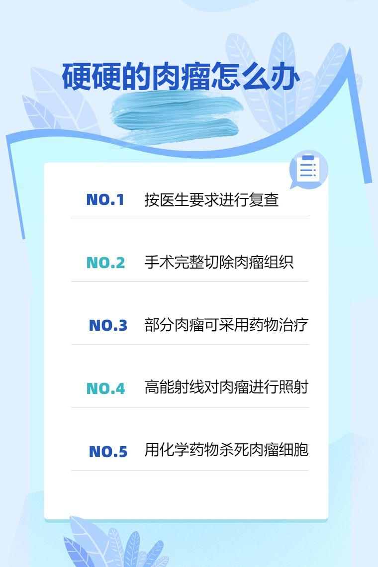 发现硬硬的肉瘤后,应及时就医明确诊断。治疗过程中要严格遵循医生的治疗方案,按时服药、定期复查。日常保持健康的生活方式,如均衡饮食、适度运动、规律作息等,以促进身体恢复,提高机体抵抗力,更好应对疾病。