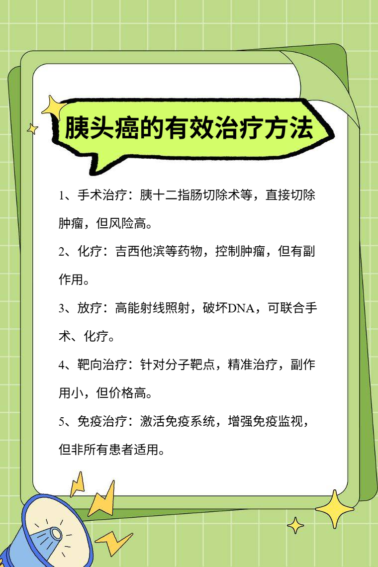 胰头癌的有效治疗方法有手术治疗、化疗、放疗、靶向治疗、免疫治疗等。