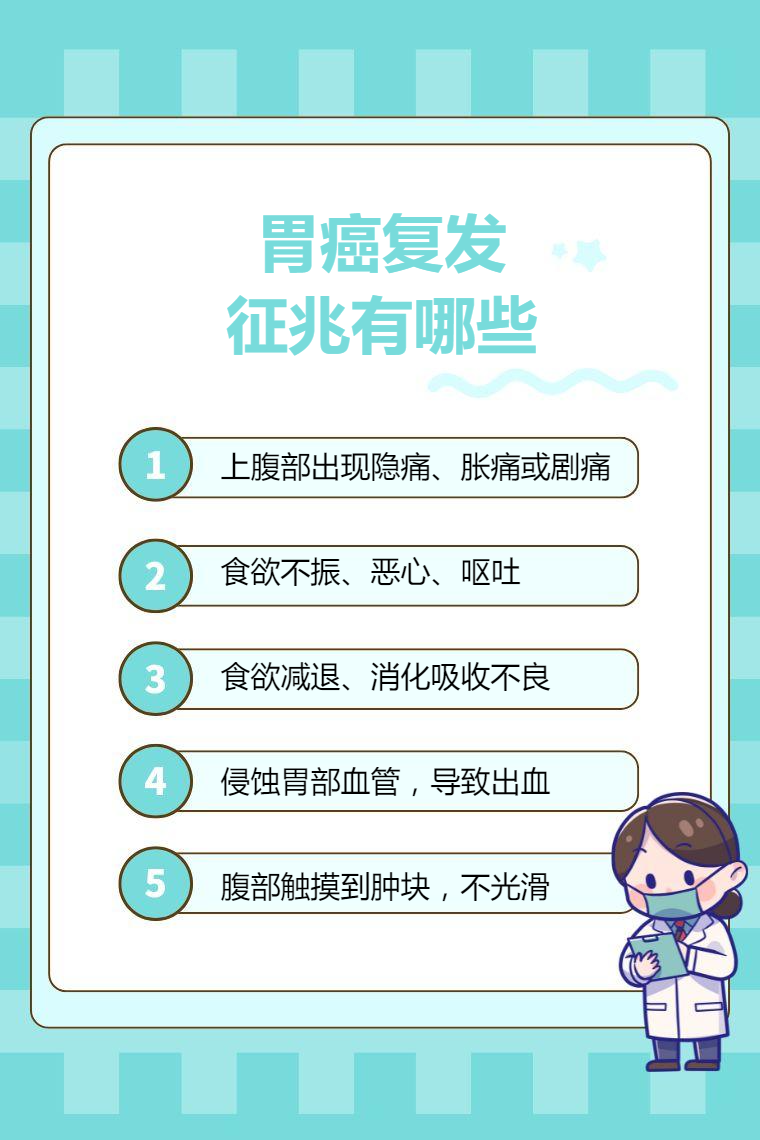 胃癌复发的征兆有腹痛、消化不良、体重下降、呕血黑便、腹部肿块等。
