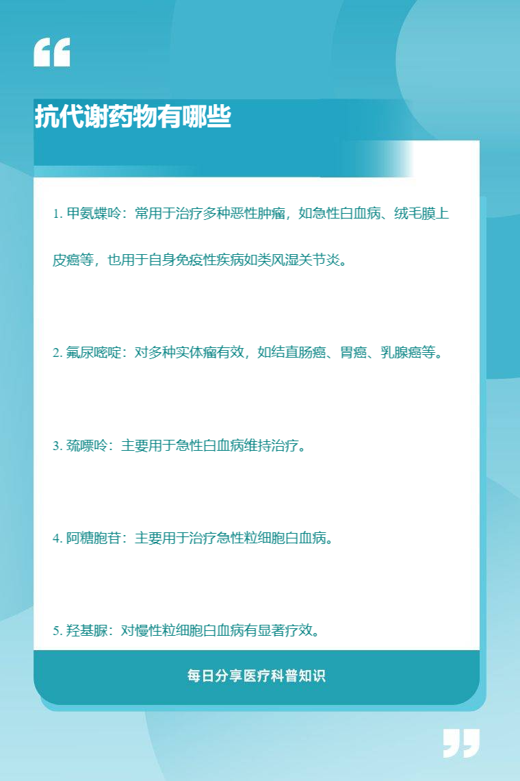 抗代谢药物有甲氨蝶呤、氟尿嘧啶、巯嘌呤、阿糖胞苷、羟基脲等。