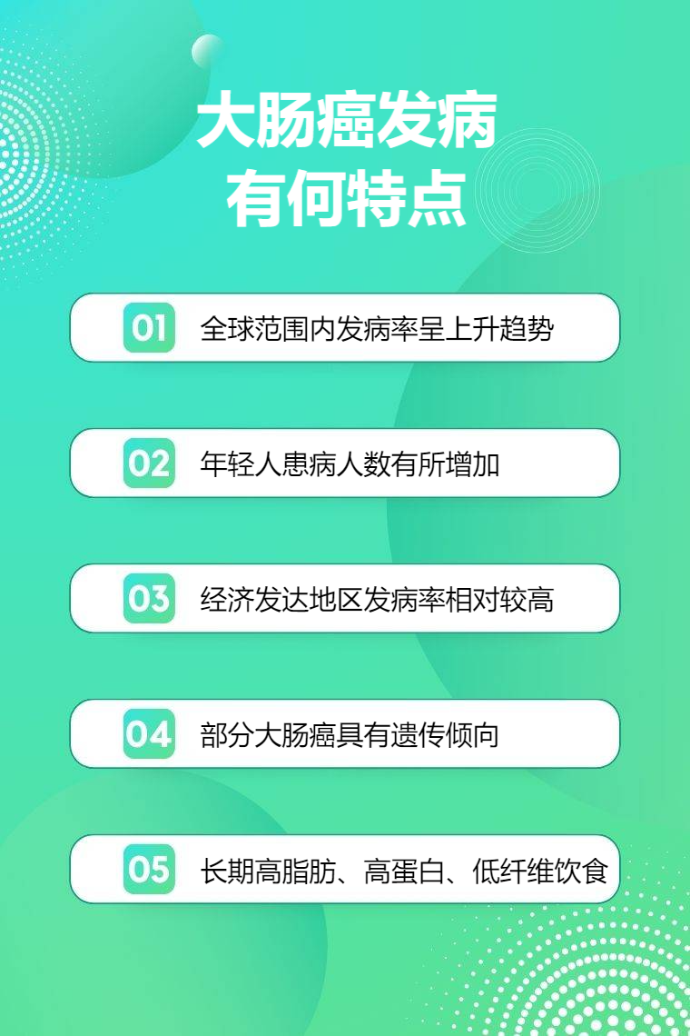 大肠癌发病特点包括发病率上升、发病年龄提前、地域差异、遗传因素影响、生活方式关联等。