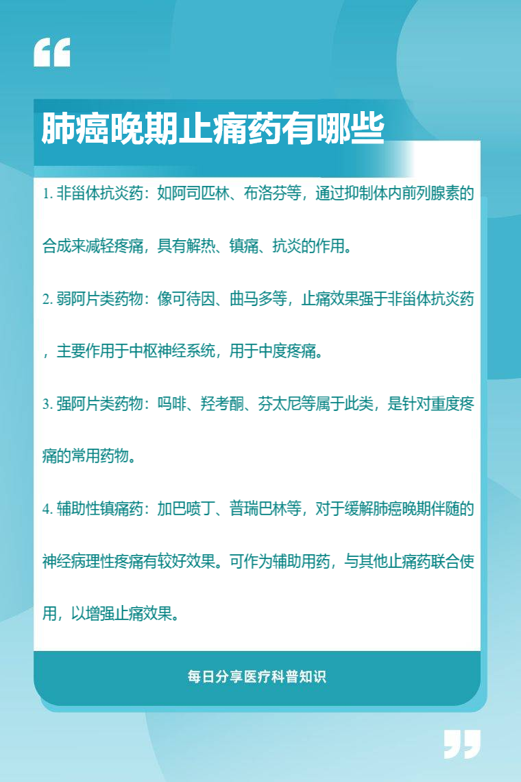 肺癌晚期止痛药有非甾体抗炎药、弱阿片类药物、强阿片类药物、辅助性镇痛药等。