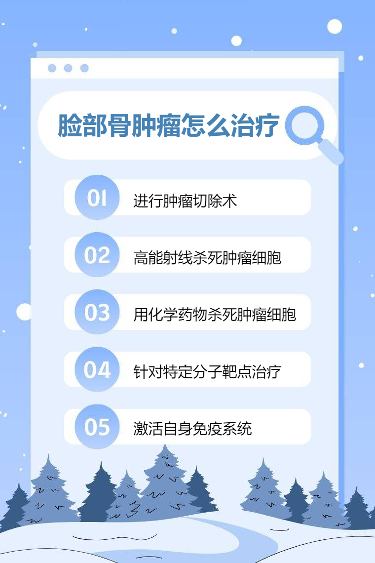脸部骨肿瘤的治疗方式有手术治疗、放射治疗、化学治疗、靶向治疗、免疫治疗等。
