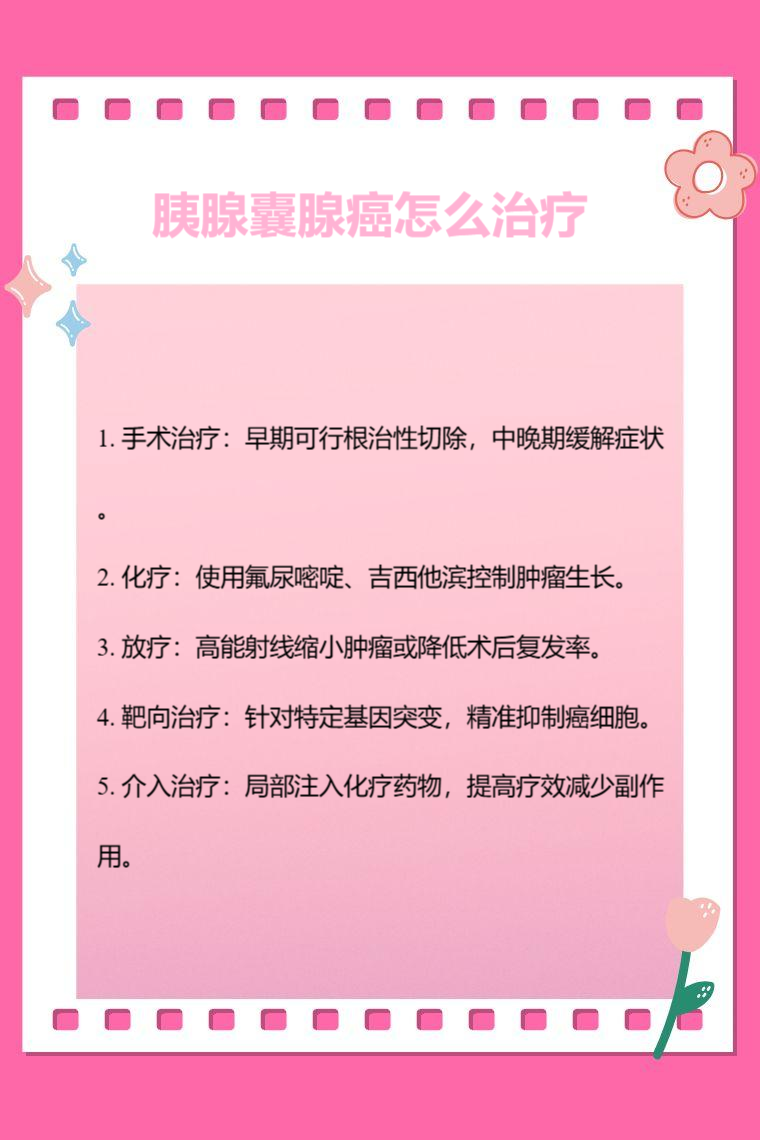 1. 手术治疗:是胰腺囊腺癌的主要治疗方式,对于早期患者,若肿瘤局限且未侵犯重要血管、神经等结构,可进行根治性手术切除,包括胰十二指肠切除术、胰体尾切除术等,尽可能完整地切除肿瘤组织,达到根治目的;对于中晚期患者,若无法完全切除肿瘤,也可进行姑息性手术,缓解症状,如解除胆道或肠道梗阻等。