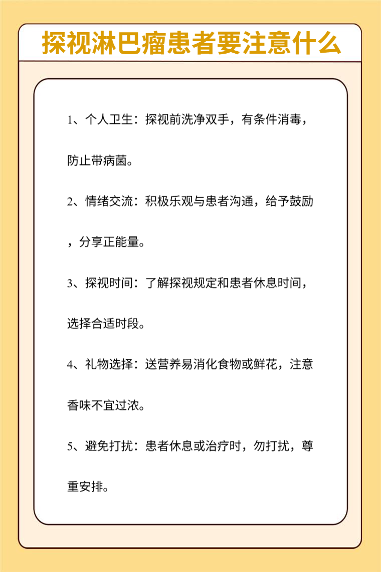 探视淋巴瘤患者要注意个人卫生、情绪交流、探视时间、礼物选择、避免打扰等。