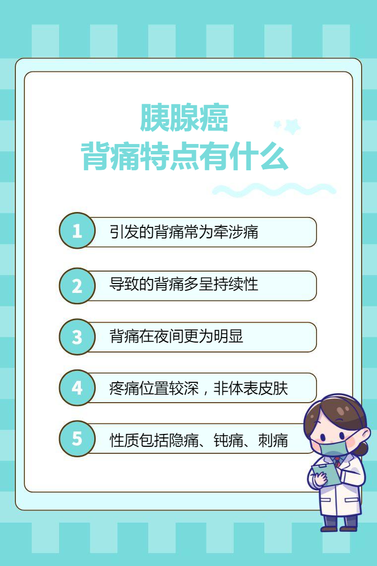 胰腺癌的背痛特点有牵涉痛、持续性疼痛、夜间加重、疼痛部位深、疼痛性质多样等。