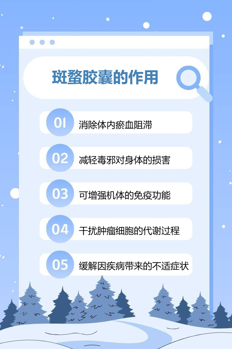 1. 破血消瘀:斑蝥胶囊中的成分可促进血液循环,消除体内瘀血阻滞,改善血液运行状态,为身体各组织器官提供充足养分,维持正常生理功能。