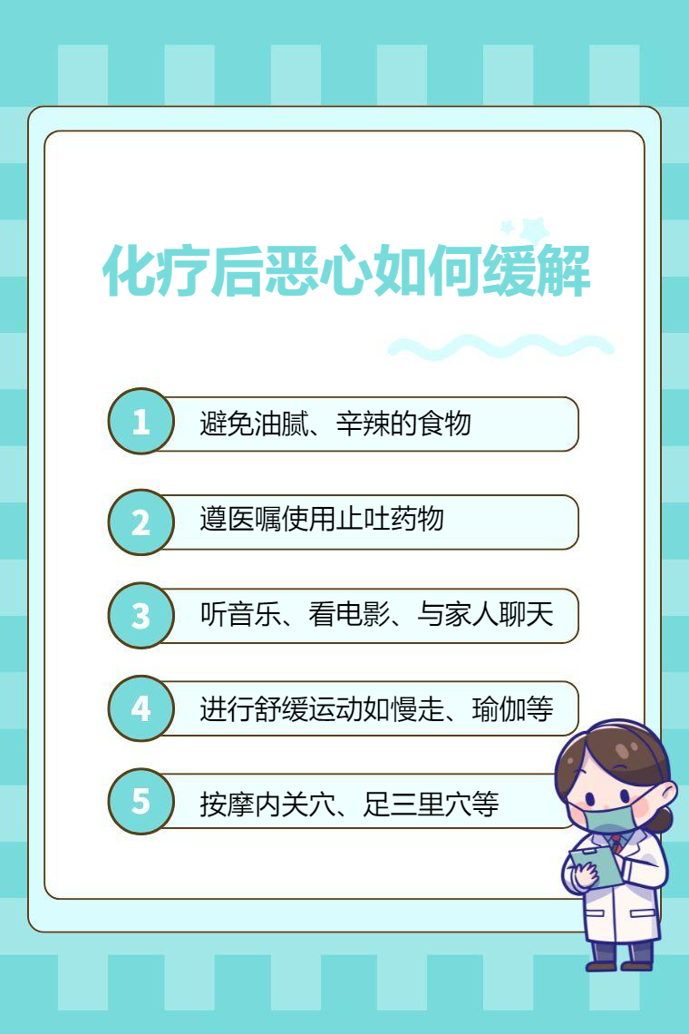 化疗后恶心可通过饮食调整、药物治疗、心理干预、适当运动、中医辅助等缓解。
