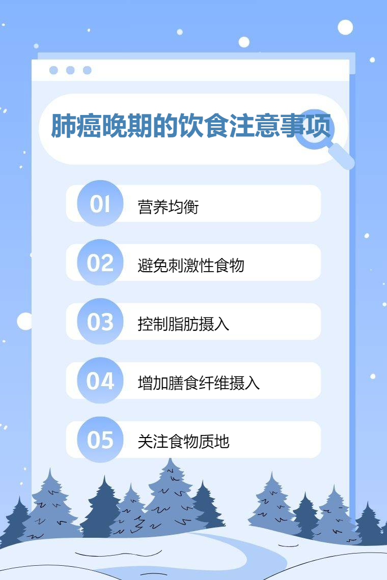 肺癌晚期饮食需注意营养均衡、避免刺激性食物、控制脂肪摄入、增加膳食纤维摄入、关注食物质地等。
