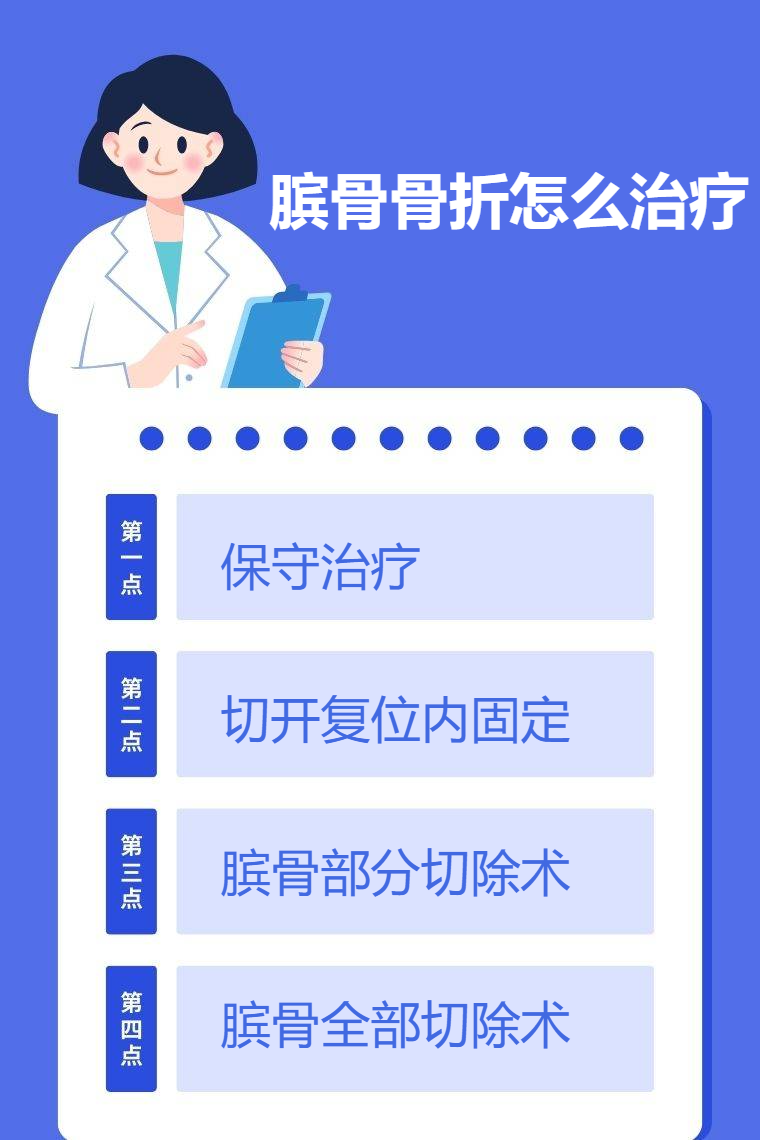 膑骨骨折的治疗方法有保守治疗、切开复位内固定、膑骨部分切除术、膑骨全部切除术等。